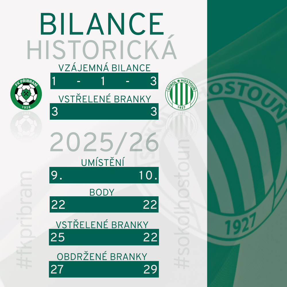 Vzájemné měření sil v srpnu vyznělo lépe pro Hostouň, která doma zvítězila 1:0. I to naznačuje, že oba týmy jsou výkonnostně velmi blízko. Očekávat lze vyrovnaný duel, v němž může rozhodnout detail – standardní situace, první vstřelená branka nebo individuální chyba.