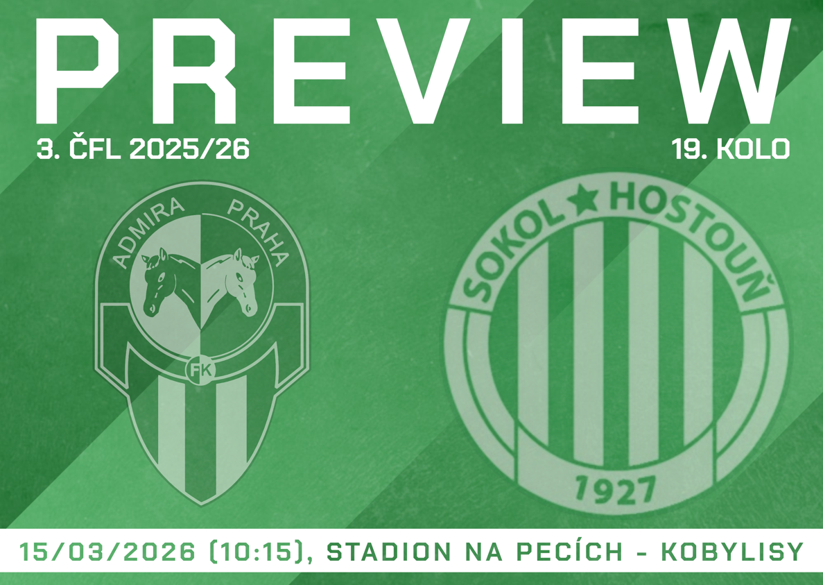 Fotbalisté Sokola Hostouň pokračují v jarní části ČFL duelem v Praze. V neděli 15. března od 10:15 se představí na hřišti FK Admira Praha v areálu Na Pecích. Domácí celek vstupuje do utkání z horní poloviny tabulky, zatímco Hostouň bude chtít bodovat a posunout se ze spodních pater soutěže.