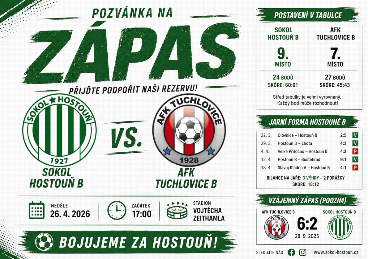 Rezerva Sokol Hostouň B čeká další důležitý domácí zápas, ve kterém půjde nejen o body, ale i o posun tabulkou. Na stadionu Vojtěcha Zeithamla dnes přivítá od 17:00 celek AFK Tuchlovice B, na který ztrácí pouhé tři body. Hostouň tak má ideální příležitost svého soupeře bodově dotáhnout a potvrdit zlepšené výkony z jarní části sezony.