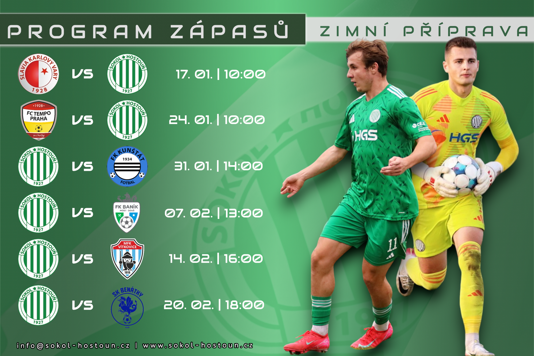 První herní test zimy přinese výjezd na západ Čech. Utkání proti tradičnímu soupeři FC Slavia Karlovy Vary prověří tým hned na úvod přípravy a poskytne trenérům první obraz o fyzickém stavu hráčů po individuální části přípravy. Druhý zápas čeká Hostouňské v Praze. Duel s Tempem nabídne konfrontaci s kvalitním soupeřem atakujícím nejvyšší příčky 4. ČFL.